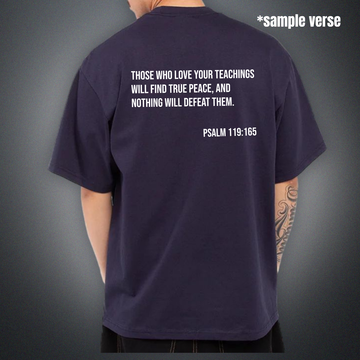 Simply pick a size, color, front logo, write down your verse and you're done.